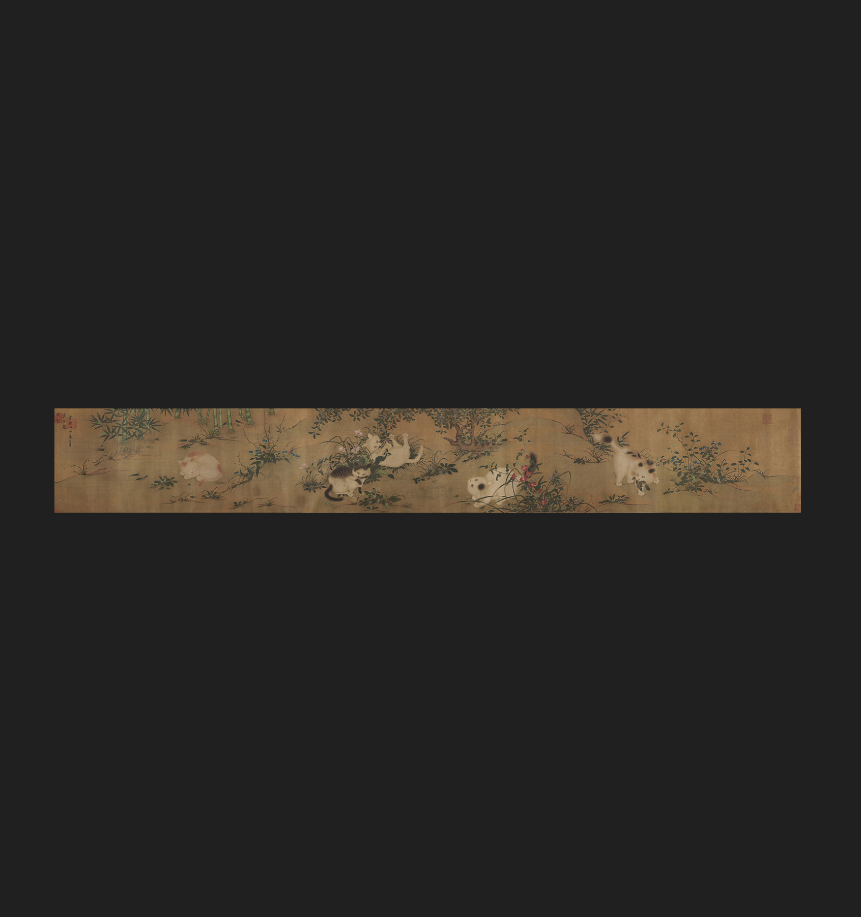 "Spring Play in the Tang Garden," also known as "Five Cats," is a handscroll painting attributed to Zhu Zhanji, the Emperor Xuanzong of the Ming Dynasty. The artwork, measuring 37.5 x 264.2 cm, is executed on paper and is currently housed in the Metropolitan Museum of Art.