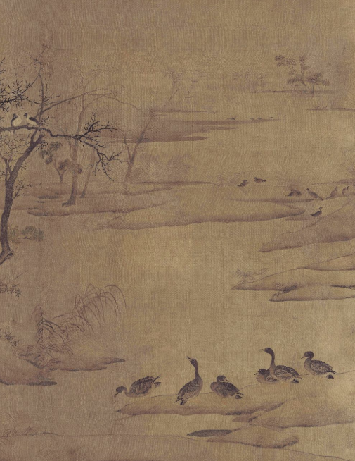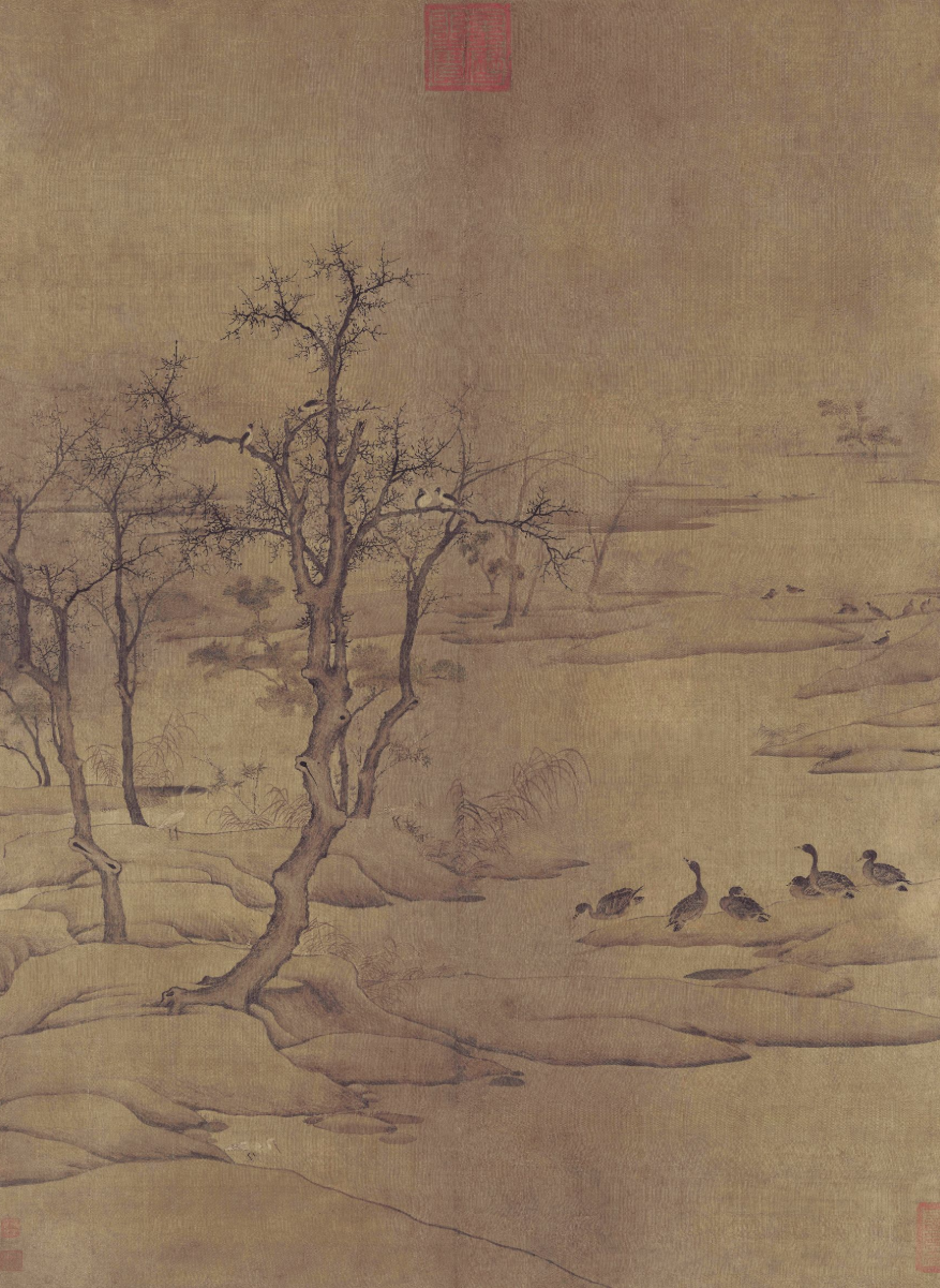 Housed in the Palace Museum, this painting is unsigned but bears collector's seals such as "Tianli Zhi Bao" and "Dianli Jicha Si Yin." It depicts a serene yet melancholic scene of geese landing on a cold shore and birds perching on ancient trees. The interconnected sandbars are dotted with sparse, leafless trees, their bare branches standing stark against the desolate landscape. The reeds by the water's edge have withered, adding to the lifeless atmosphere. In the twilight, four crows settle on the trees, while a group of geese rest on the shore—some calling out, others lying quietly. The mood is tranquil yet chilling, evoking a profound sense of solitude. In the distance, a flock of geese takes flight together.
