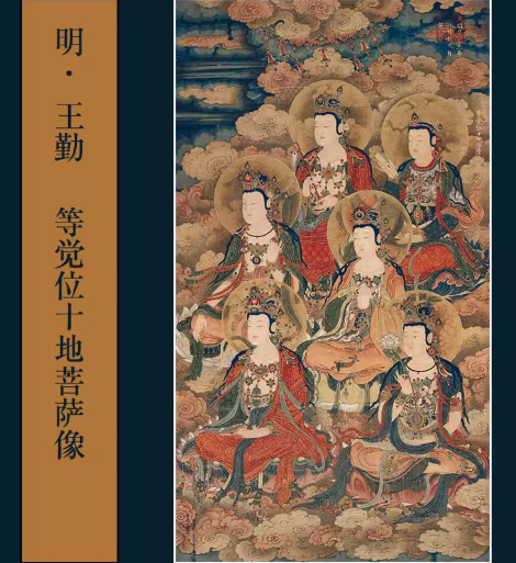 This Ming Dynasty court painting, created by Wang Qin, is a Shuilu painting (a type of ritual Buddhist art) that depicts the "Stage of Equal Enlightenment" (Dengjue Wei), which refers to the 51st stage of a Bodhisattva's 52-stage path to Buddhahood. It signifies a level of enlightenment nearly equal to that of a Buddha, with only one step remaining. The "Ten Bhūmis" (Shidi) represent the ten critical stages of a Mahayana Bodhisattva's spiritual journey. This scroll illustrates the ten Bodhisattvas who have attained these stages, embodying the final steps before achieving Buddhahood. Each Bodhisattva is portrayed with a serene and compassionate expression, adorned in intricate and luxurious jewelry, scarves, heavenly robes, and skirts. They each hold unique ritual objects and mudras (hand gestures), symbolizing their distinct spiritual attributes. This scroll is currently housed in the Cleveland Museum of Art.