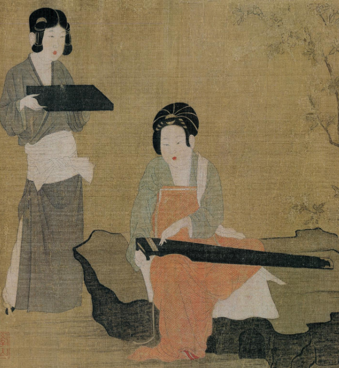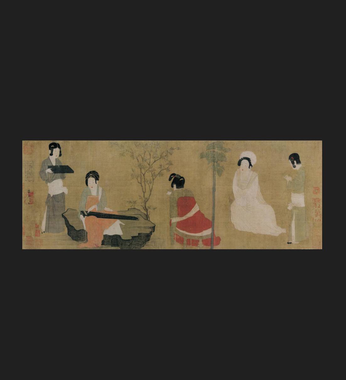 The painting depicts three noblewomen seated in a courtyard, attended by two maidservants, engaging in the refined activities of playing the qin (a traditional Chinese string instrument), savoring tea, and enjoying music. This scene captures the leisurely and tranquil lifestyle of aristocratic women. The artwork features osmanthus and phoenix trees, symbolizing the arrival of autumn. The noblewomen seem to anticipate the inevitable withering that follows the blooming season. The silk shawls slipping off the shoulders of the women tuning the qin and sipping tea reveal their languid and melancholic state, evoking a sense of drowsy ennui.