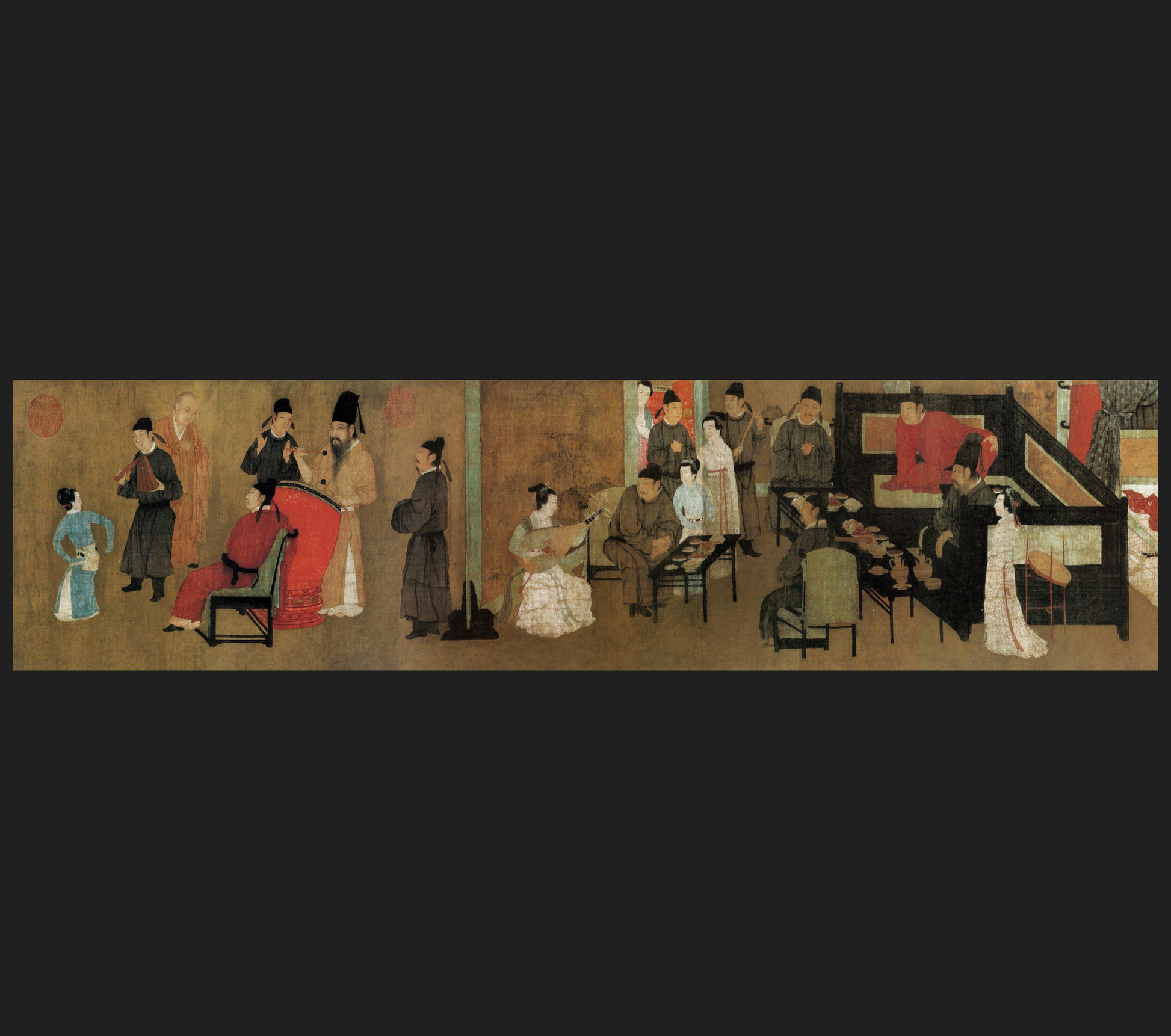 This exquisite artwork vividly recreates a historic night banquet hosted by Han Xizai, a prominent minister of the Southern Tang Dynasty. It captures the lively atmosphere of the gathering, featuring music, dance, and the mingling of guests, while also revealing the complex personality of Han Xizai, who appears both carefree and melancholic. The painting is divided into five sections, each depicting a different moment of the evening: