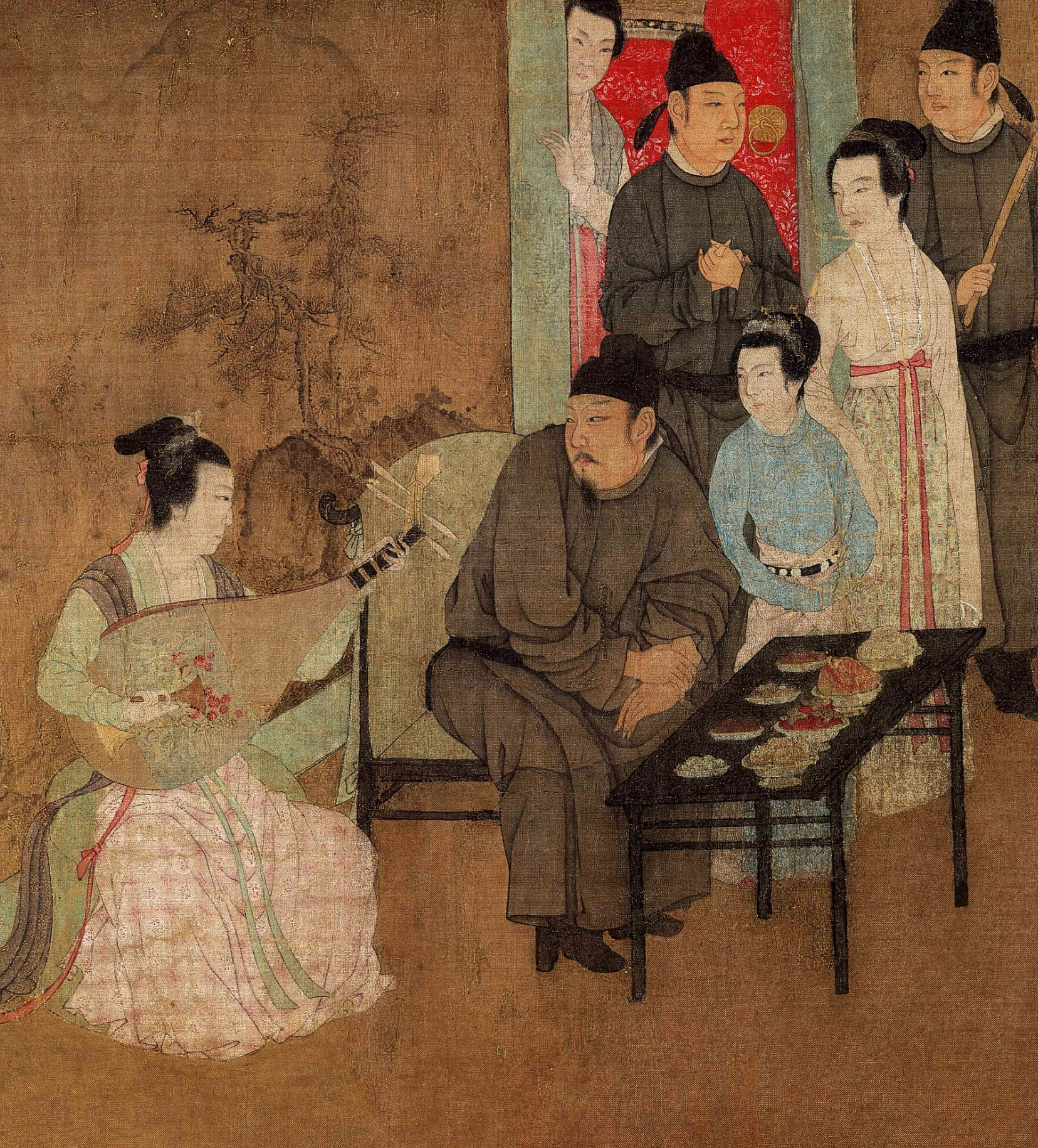 Listening to Music: Han Xizai and Lang Can, the top scholar, sit on a couch, engrossed in the pipa performance by the sister of Li Jiaming, the deputy director of the Imperial Music Bureau. Other guests, including Zhu Xian, Chen Zhiyong, Shu Ya, and the courtesan Wang Wushan, are also present.
